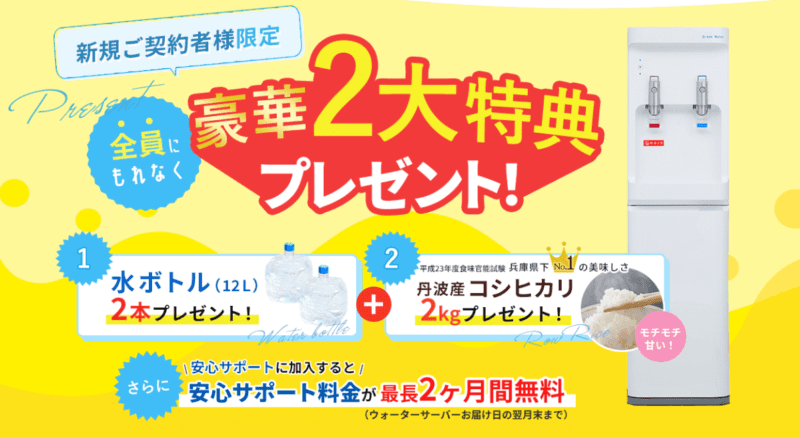 | 新規契約のみ | ①新規特典 | 天然水2本 + コシヒカリ2kg |