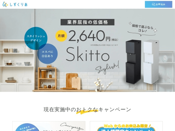 しずくりあは、月額定額で使いやすい浄水型ウォーターサーバーです。月額2,640円(税込)のSkittoは、初期費用やフィルター代、フィルターの配送料が追加でかかりにくい料金設計として案内されています。料金や条件は変更されることもあるので、最新情報は公式ページでもご確認くださいね。