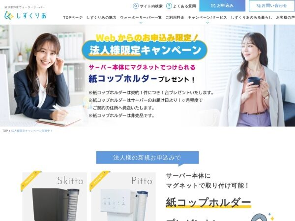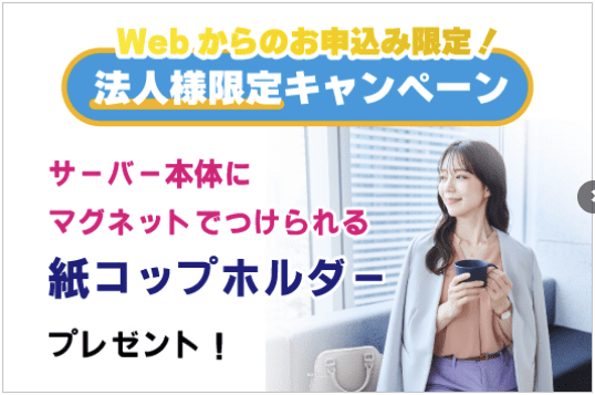 しずくりあでは法人様限定で、Web申込みの方に紙コップホルダーをプレゼントするキャンペーンが案内されています。紙コップホルダーは契約1件につき1台までが基本のため、適用条件は公式サイトの案内をご確認くださいね。