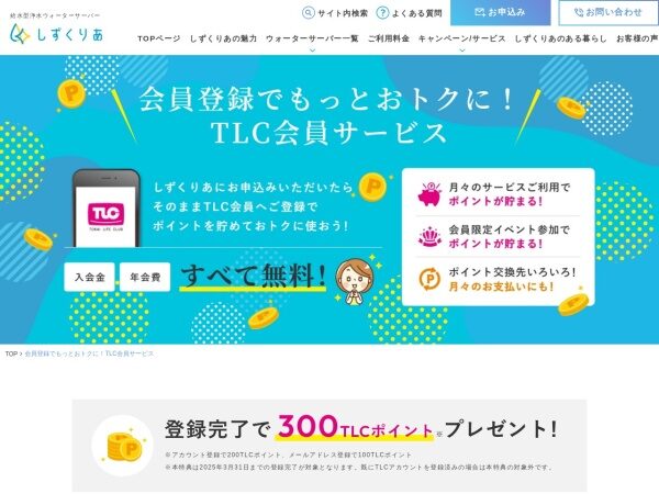 しずくりあではTLC会員サービスが案内されています。基本は、毎月のご利用金額200円につき1ポイントが貯まり、ポイントをお支払いに使える仕組み(1ポイント=1円)も用意されています。なお、登録特典(例:アカウント登録やメールアドレス登録でもらえるポイント)には期限や条件が設定されている場合があるため、最新情報は公式ページでご確認くださいね。
