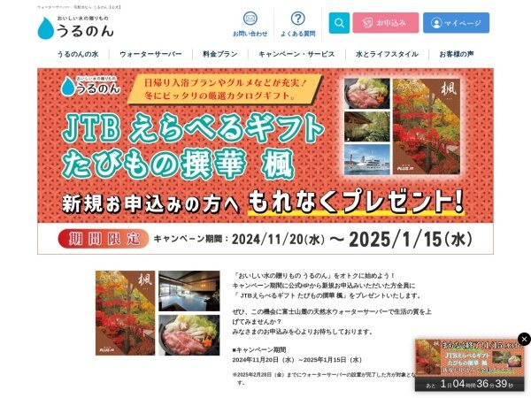 うるのんではJTBギフトプレゼントキャンペーンを実施中です。新規申込みでJTBギフトがもらえるチャンス!他にも、天然水プレゼントや乗り換えキャッシュバックなど、お得なキャンペーンが盛りだくさんです。