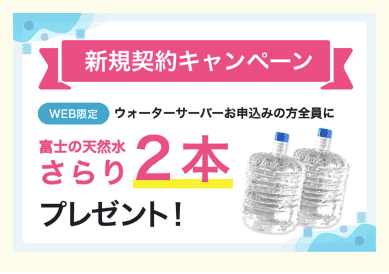 うるのんではWEB限定で新規申込みの方全員に「富士の天然水さらり」2本プレゼントキャンペーンを実施中です。今ならお得にウォーターサーバーを始められますよ!