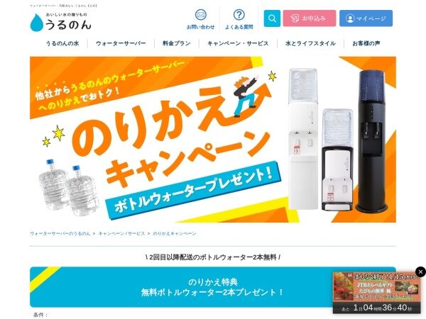 うるのんではのりかえキャンペーンを実施中です。他社からの乗り換えで最大16,500円のキャッシュバック、または解約金がない場合は水ボトル2本プレゼント!お得に始められます。