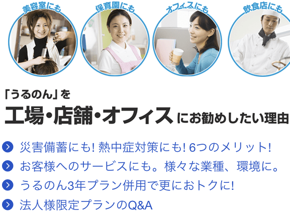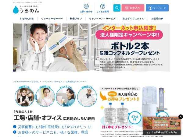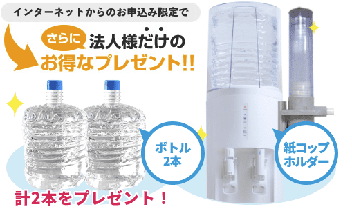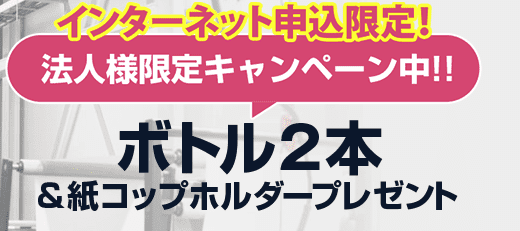うるのんではインターネット申込限定で、法人様向けに特別なキャンペーンを実施中です。ボトル2本と紙コップホルダーが無料でもらえます!