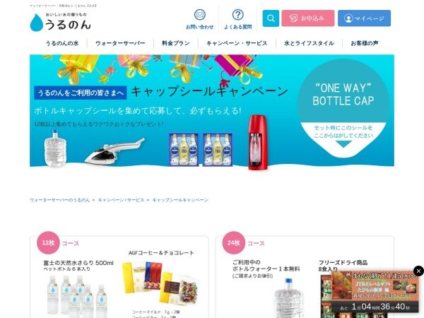 東海ウォーターサーバーうるのんではボトルキャップシールを集めて応募するキャンペーンを実施中です。12枚から144枚まで、集めた枚数に応じて様々な豪華賞品がもらえます!