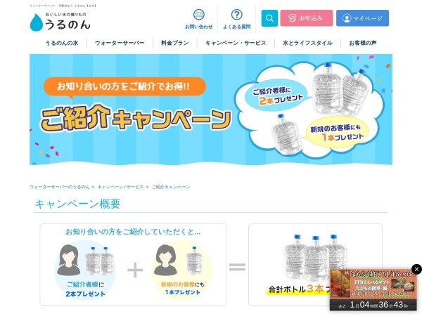 うるのんでは友達紹介キャンペーンを実施中です。お友達を紹介すると、あなたと友達の両方に「富士の天然水さらり」がプレゼントされます!紹介者様は2本、新規のお客様は1本です。